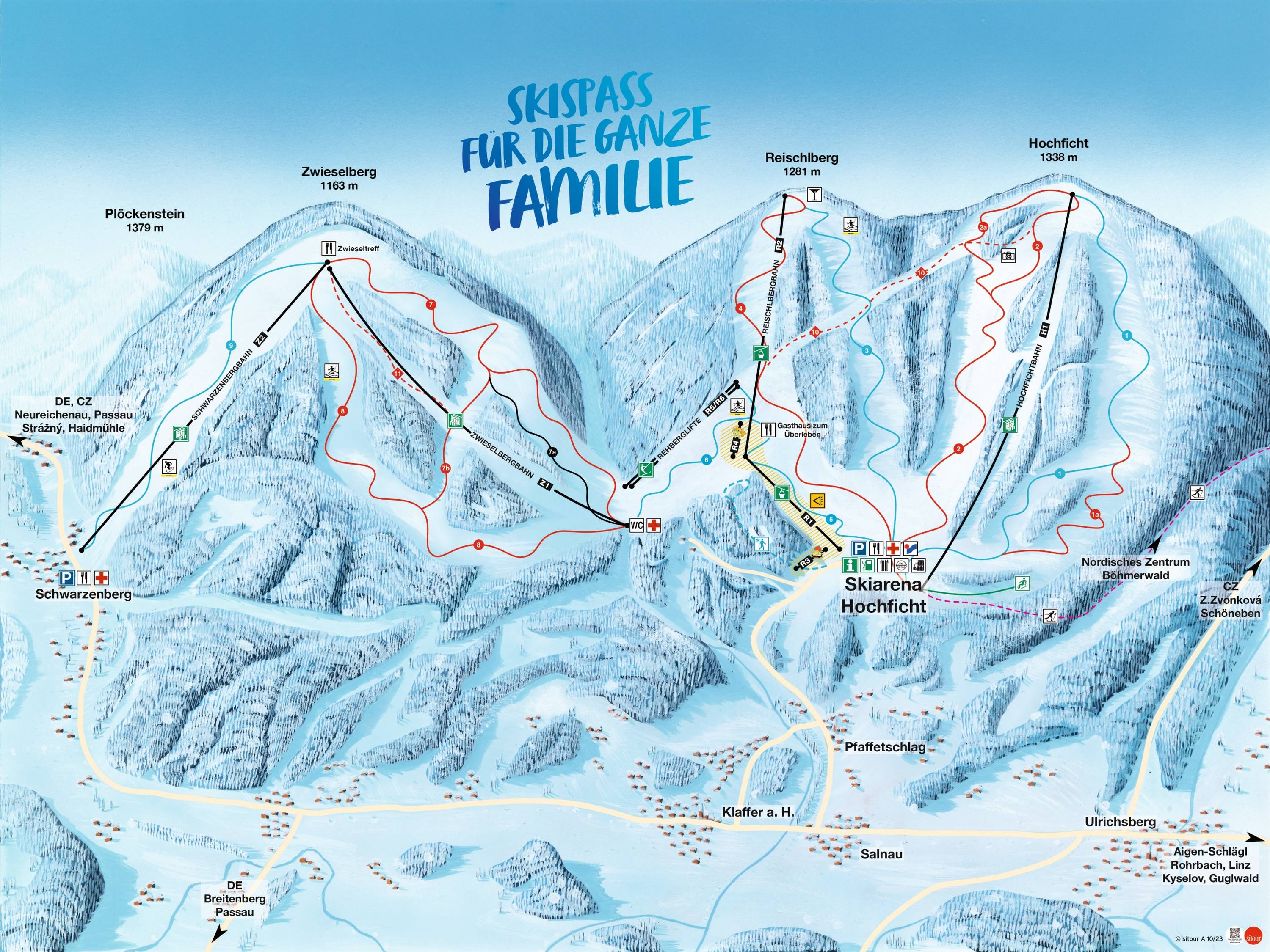 The piste map provides an excellent overview of the entire Hochficht ski area. All slopes, lifts, and other attractions are clearly marked. On the back, you will find prices and new features for the winter season.