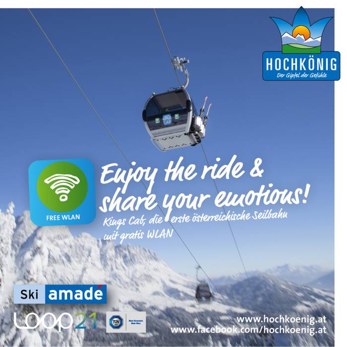 Austria's first cable car lift with WLAN on the HochkoenigMuehlbach am Hochkönig (17.09.2013) - As a pioneer in Austria, the Hochkoenig ski resort (Muehlbach-Dienten) has equipped the Kings Cab lift with wireless LAN and the "Mountainment®" information service. The wireless specialist, Loop21, is managing the project, providing hardware and software and making WLAN a modern information platform for guests."The Hochkönig Bergbahnen (lift company) is always looking for unique and extra offerings for our guests in addition to skiing and snowboarding," explains Michael Emberger, Managing Director of Hochkönig Bergbahnen. "We are very pleased to be the first Austrian lift company in Ski amadé to make this unique product available to our guests. We have found a partner, Loop21, with whom we can realize this innovative project, which is a combination of WIFI and an information source."The wireless network stretches along the entire length (over 2 kilometers) of the 8-person cable car lift. The ski guests are offered an uninterrupted, modern WLAN information platform called "Mountainment®". Local information about weather, trail maps, a direct link to the app download as well as access to Facebook and the internet are available. The quick, uncomplicated access to the content guests need and search for while traveling increases the levels of comfort and satisfaction.