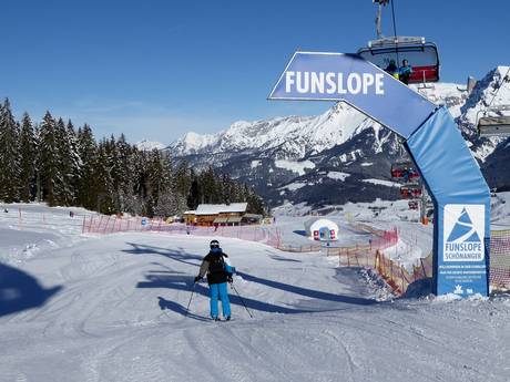 The Funslope Schönanger starts at the mountain station of the Schönangerbahn. The slope offers waves, banked turns, and other fun elements for skiers and snowboarders of all ages and skill levels. Everyone completes the course at their own pace, and having fun is the main thing. The adjacent small Family Park features small kickers.