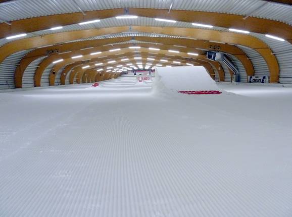 In the Ice Mountain indoor ski hall, there are two easy slopes. The main slope is 210m long and 30m wide. The beginner slope is 90m long and 30m wide. In total, 300m of slopes are available.