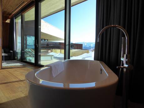 The Albergo offers several different suites with magnificent panoramic views. Here you can enjoy luxurious comfort and coziness at 2,340 meters above sea level, right in the middle of the Hochzillertal ski area. Most suites feature a freestanding bathtub and an infrared cabin with panoramic views. In the evening, guests are treated to culinary delights. The Albergo Spa offers a sauna, relaxation rooms, and an outdoor whirlpool. After an eventful day on the slopes, this is the perfect place to unwind.