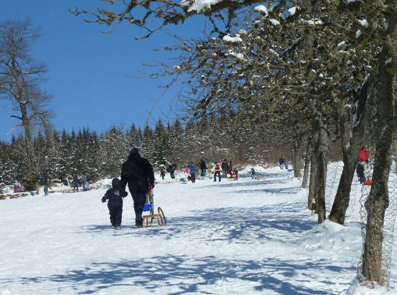 On the opposite slope, there is also a particularly beautiful toboggan run, which is secured with a safety fence by the road in case someone goes too fast.