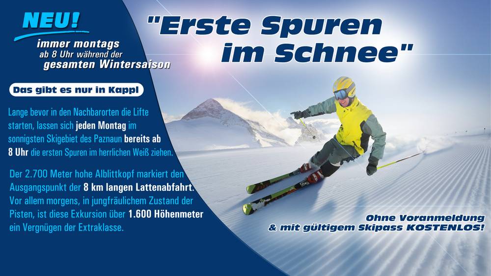 Every Monday throughout the winter season: First tracks in the snowOnly offered at Kappl: Long before the lifts start in neighboring villages, the first tracks in the snow are made in the sunniest ski resort in Paznaun. Every Monday, the Dias, Alblitt and Alblittkopf lifts open already at 8:00 AM. An experienced guide from Kappl Aktiv ski school accompanies winter athletes who just can't get enough of the snow.2009/2010