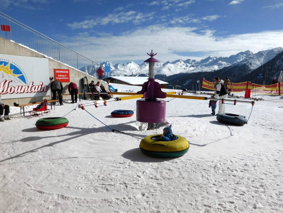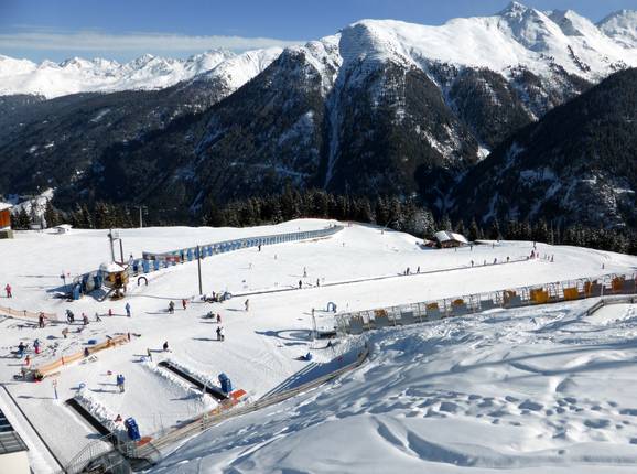 The adventure park at the mountain station of the Dias gondola offers an attractive, very large practice area at a snow-sure 1,830 m. Several magic carpets (mostly covered), the children's slope Flaxiabfahrt, the archway area, the wave slope, the mogul slope, and the ski carousel delight families and children in Kappl.