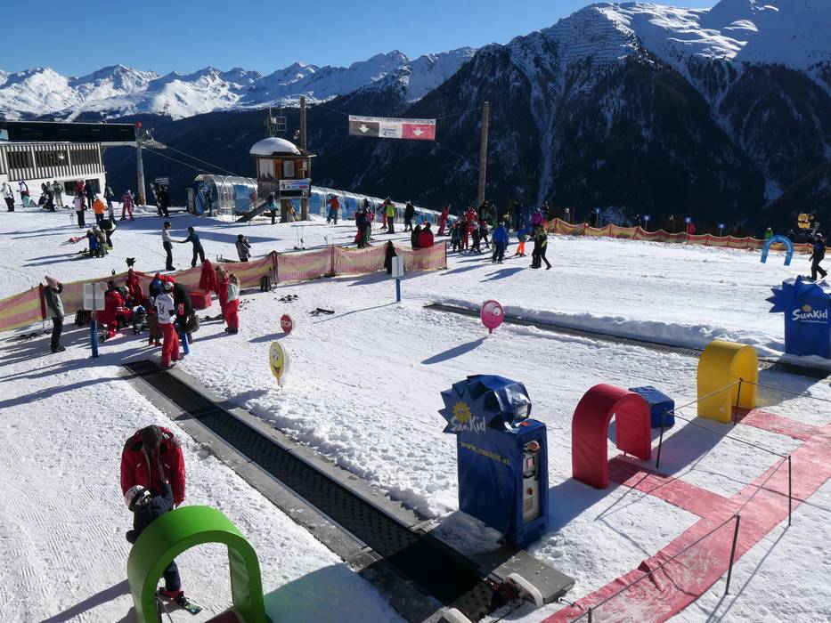 The adventure park at the mountain station of the 10-seater Dias gondola offers a very attractive and spacious practice area at a snow-sure altitude of 1,830 m. Several magic carpets (mostly covered), the Sunny Waveline, the Sunny Funline, the children's practice area, the archway area, the wave slope, the mogul slope, and the ski carousel delight families and children in Kappl. The ski school and the guest kindergarten are also located right here. A perfect children's paradise!