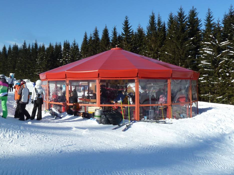 Just before the parking lot at the valley station of the Dámska chairlift, an après-ski umbrella bar awaits guests.
