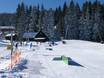 The snowpark at the Vlek MiniAreál drag lift offers kickers, boxes, and rails as well as a cross course.