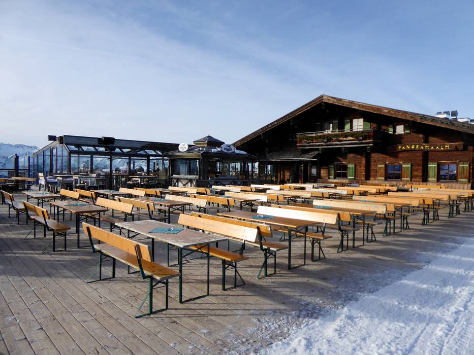 The view from the sun terrace is truly special – you won't find a panorama like this again anytime soon. The rustic mountain hut with its cozy parlors and delicious food attracts guests from all over the ski area. The bar on the sun terrace is a popular meeting point.