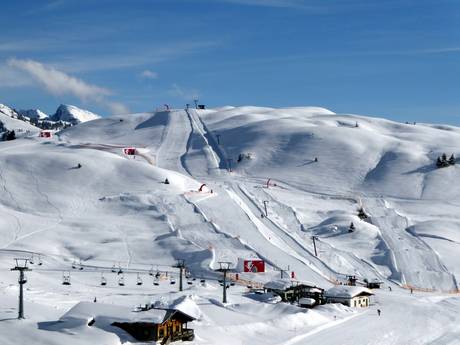 The Skillpark Jufenbeach is located in the Streiteckmulde on the Hahnenkamm and is an ideal training area for freestyle fans of all levels. It features a parallel slalom with Skimovie course, a mogul slope, and a Big Airbag Jump. A conveyor belt ensures a comfortable ascent.