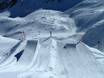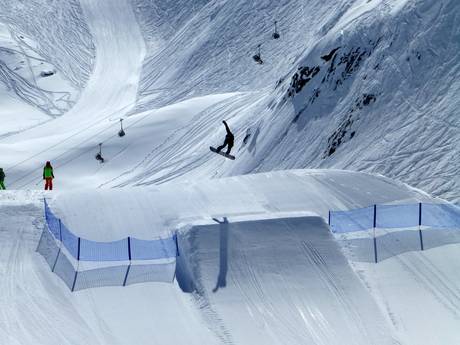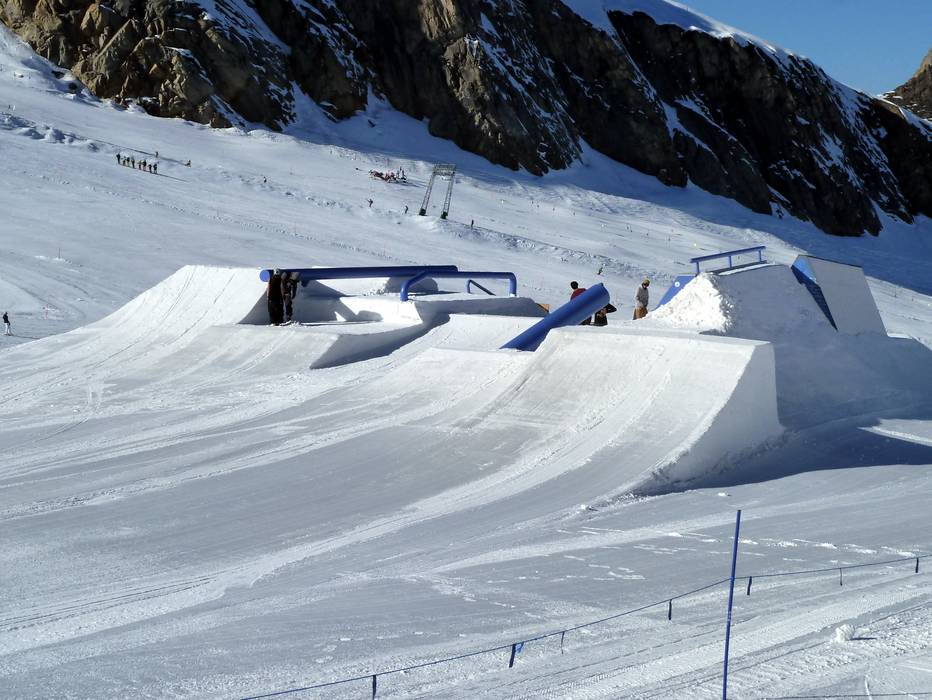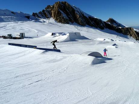 The Glacier Park Kitzsteinhorn is open in autumn and spring. In winter, the park is closed. At the snow-sure altitude of 2,900 meters, both beginners and advanced riders can work on their technique. The park is 250 meters long and 100 meters wide and features around 20 obstacles.