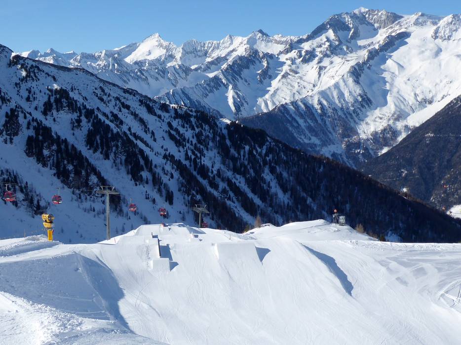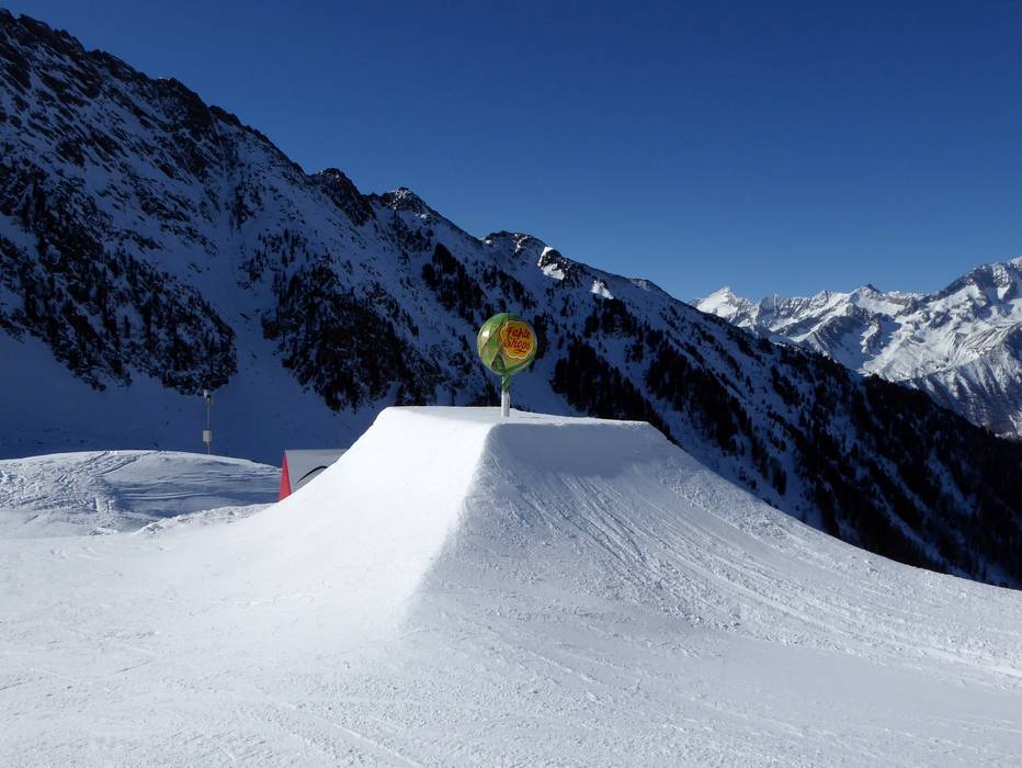The Snowpark Funtaklaus at the K2 gondola offers freestyle fans everything their hearts desire: boxes, rails, and kickers for beginners, advanced riders, and pros. There is a suitable challenge for everyone. The Funtaklaus Park is very snow-sure at over 2,200 meters.