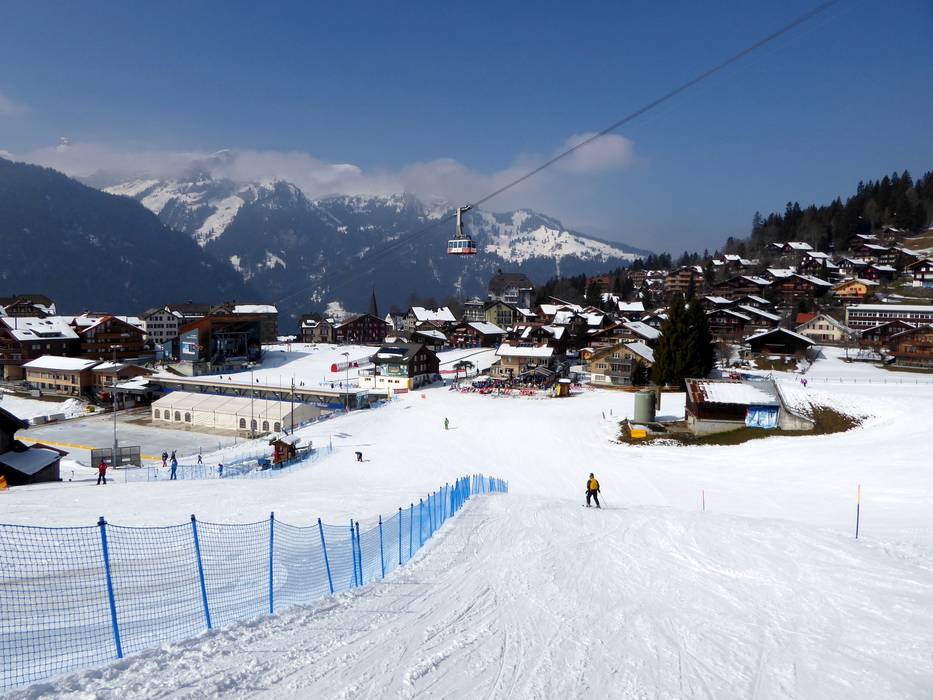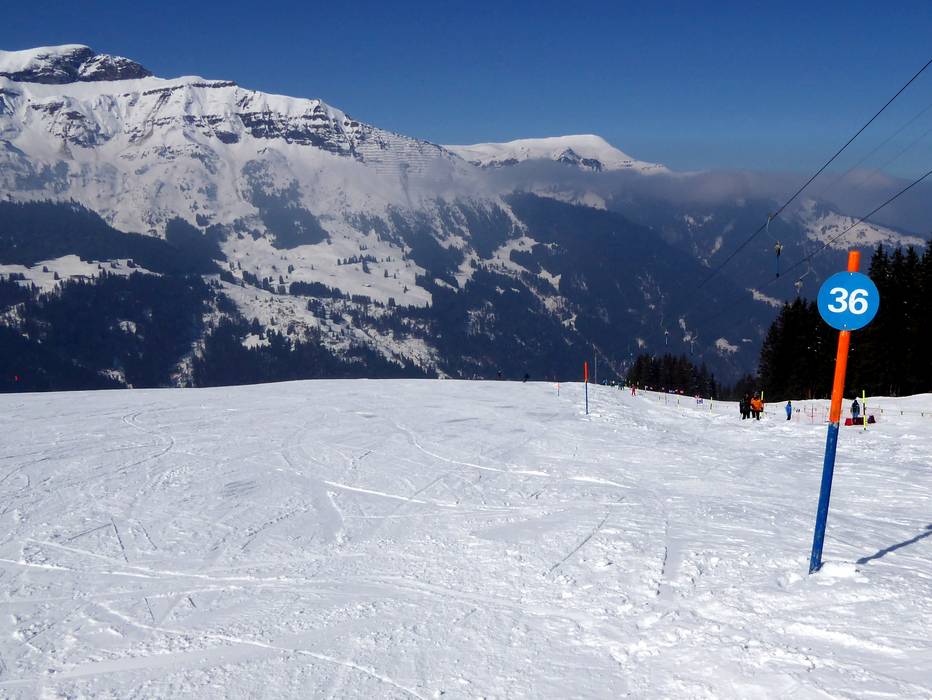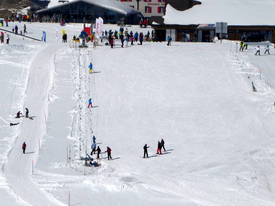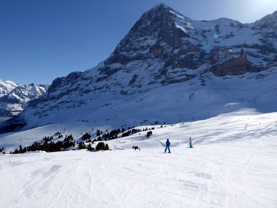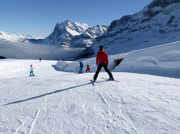 Grindelwald and Wengen offer ideal conditions for beginners. Directly below the Kleine Scheidegg (easily accessible from Grindelwald and Wengen by cog railway), there is the large Beginner's Park Kleine Scheidegg with a covered conveyor belt and rope tows. On the Männlichen (easily accessible from Grindelwald and Wengen by cable car), beginners can practice their first turns at two practice lifts and a conveyor belt in the Kinderparadies Männlichen. Right in Wengen, there is a beginner area with two rope tows. The Swiss Ski and Snowboard School Wengen operates its own beginner area with conveyor belts. From the Kleine Scheidegg, several easy slopes lead down via Alpiglen and Brandegg all the way to Grindelwald. These are very long and easy for beginners to manage. In the direction of Wengen, beginners will find ideal slopes up to the Wengernalm. Further down towards Wengen, the slope becomes intermediate, and beginners should take the cog railway back to the valley. On the Männlichen, beginners will find two easy slopes at the Läger and Männlichen four-seater chairlifts. One of them is the Wasserwendi Slow-Slope (a special slope for slow skiing). The valley run from Männlichen to Grindelwald is not recommended for beginners.