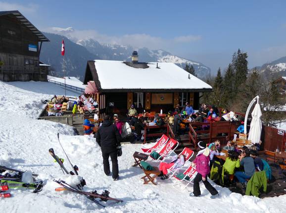 The Kleine Scheidegg/Männlichen ski area offers a wide variety of places to stop for refreshments. Throughout the ski area, you’ll find rustic mountain huts, restaurants, and snack bars. There are also many beautiful sun terraces with views of the Eiger, Mönch, and Jungfrau. Swiss specialties are predominantly served.