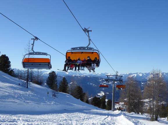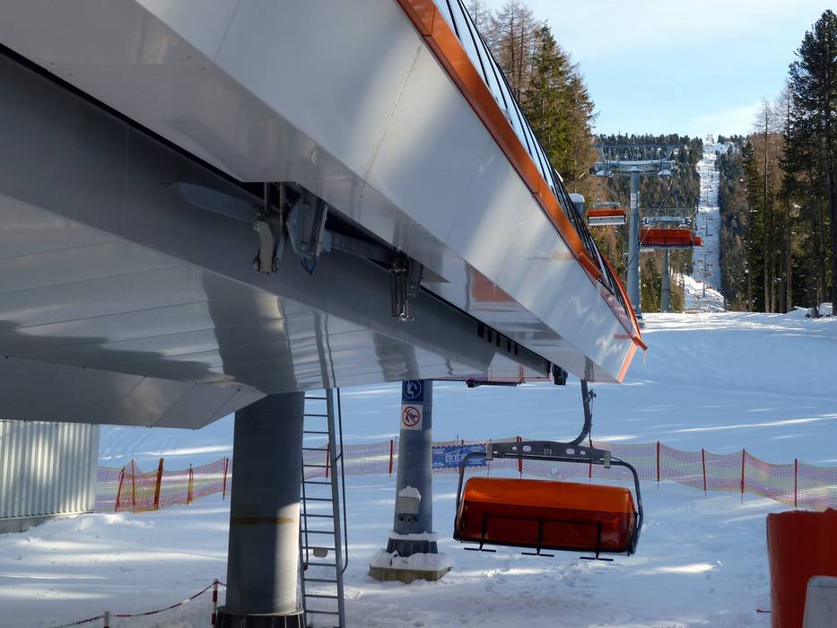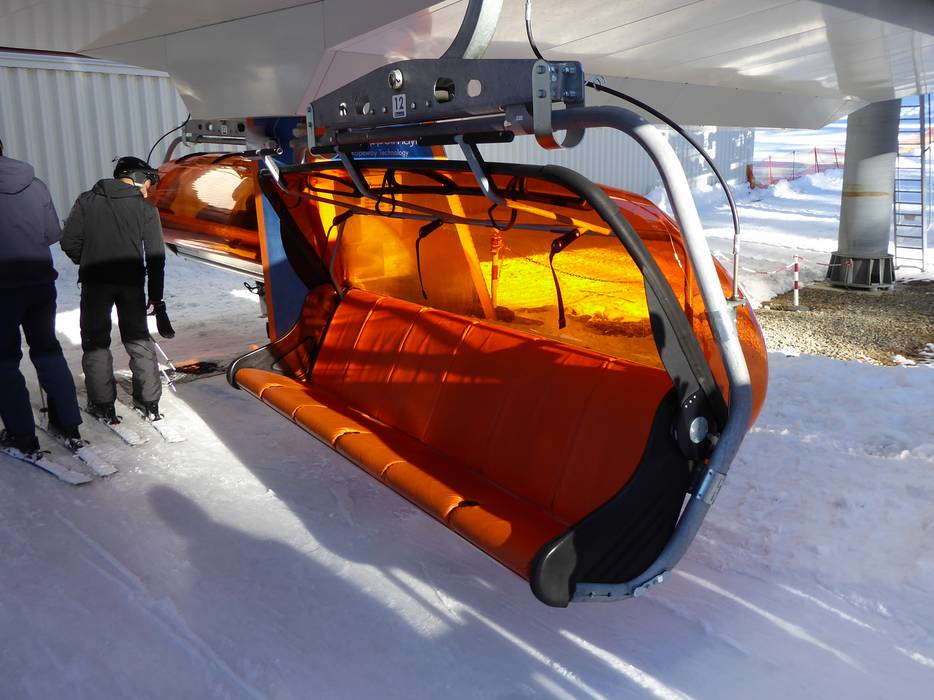The Panoramabahn Sixpack is a 6-seater chairlift with orange weather protection covers.
