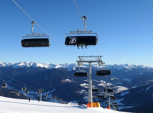 At Kronplatz, there are only modern chairlifts and gondola lifts. Several cable cars are even equipped with heated leather seats. A highlight is the Ried-Gipfelbahn, which transports winter sports enthusiasts directly from the Percha train station to the summit of Kronplatz over a total distance of more than 6 kilometers. To ensure safety for children, gondola lifts are even being built in the beginner areas. Kronplatz is home to the shortest eight-seater and twelve-seater gondola lifts in the world.