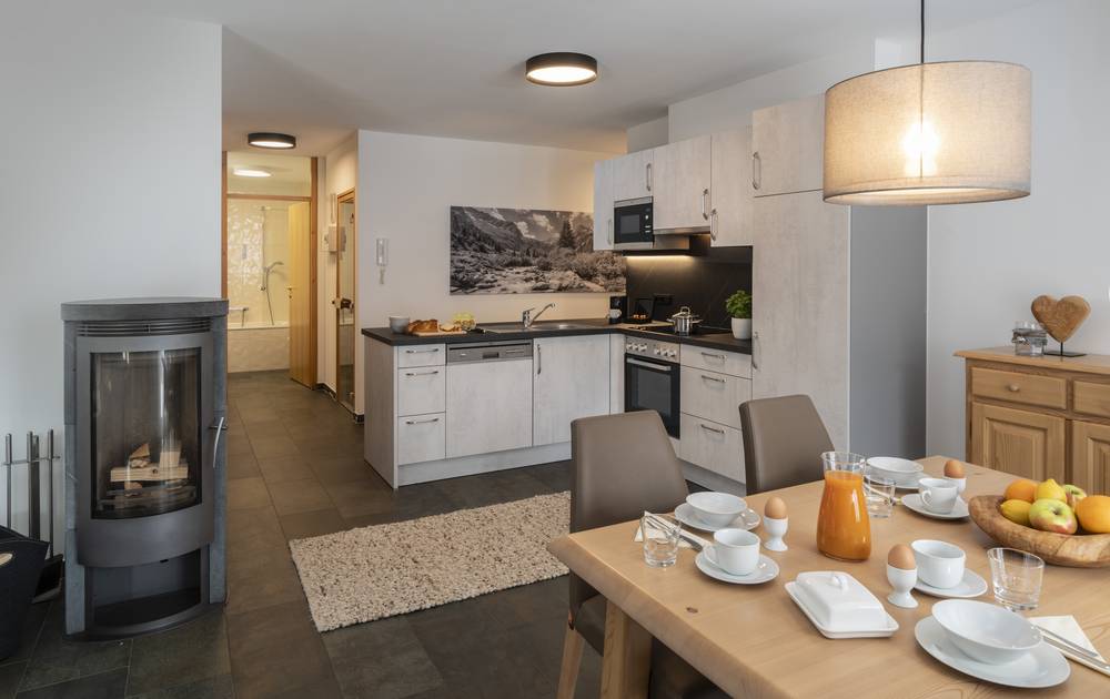 You will stay in tastefully furnished apartments with your own balcony or terrace. Our kitchens are perfectly equipped and invitingly designed to give you that feeling of being at home. Everything you need for culinary delights and creative cooking adventures is provided. In addition, you can look forward to a fitness room and a secure storage room for skis and bikes in every building. Some of our apartments also feature fireplaces and private saunas—perfect for warm, romantic evenings. How wonderful it is to relax exclusively in your own private oasis of well-being after an eventful day.