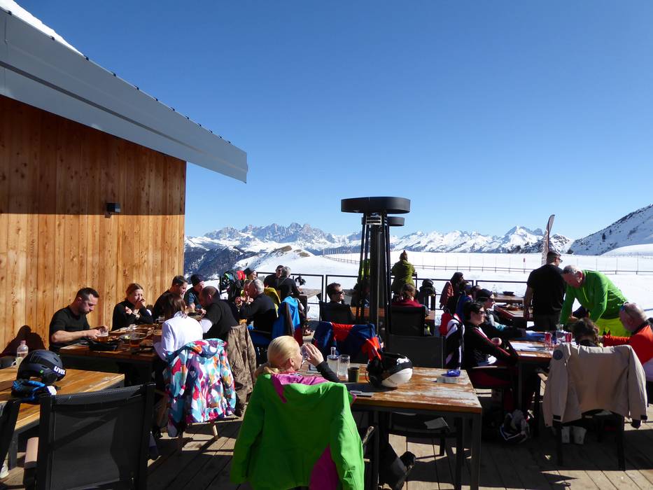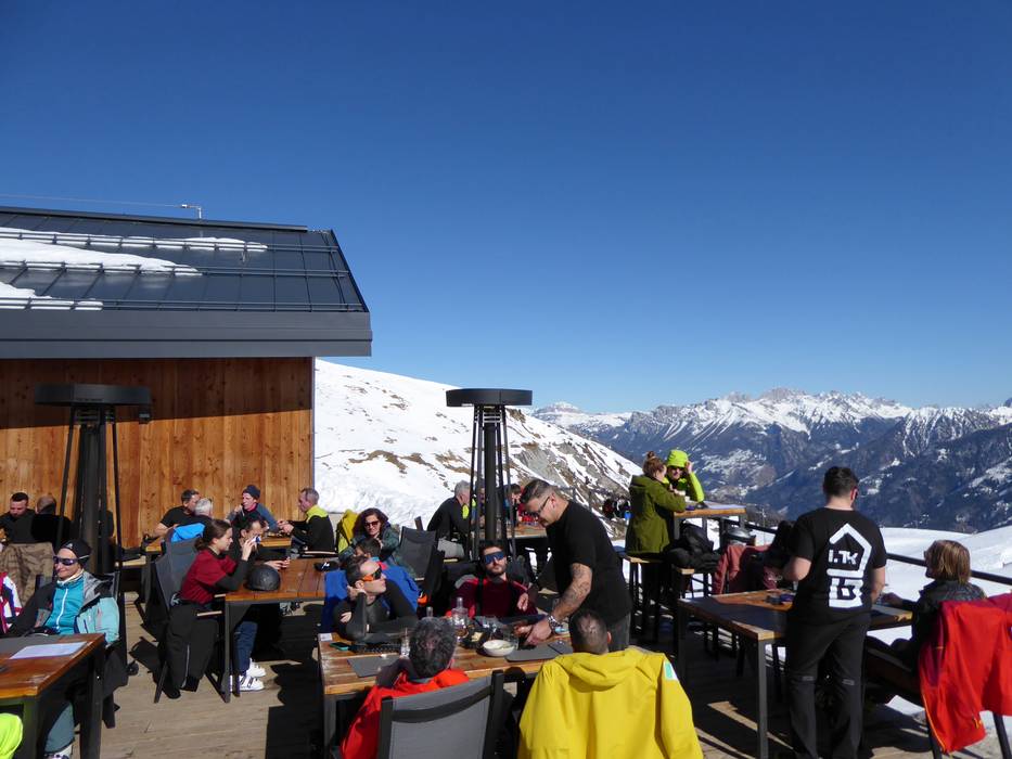 Baita Gardoné also refers to itself as "The Mountain Riviera," as here you can relax in a deck chair under (artificial) palm trees and enjoy the sun. There is a large serviced area and a self-service restaurant offering typical Trentino and South Tyrolean dishes. In the serviced area, you can order exclusive wines and excellent food.