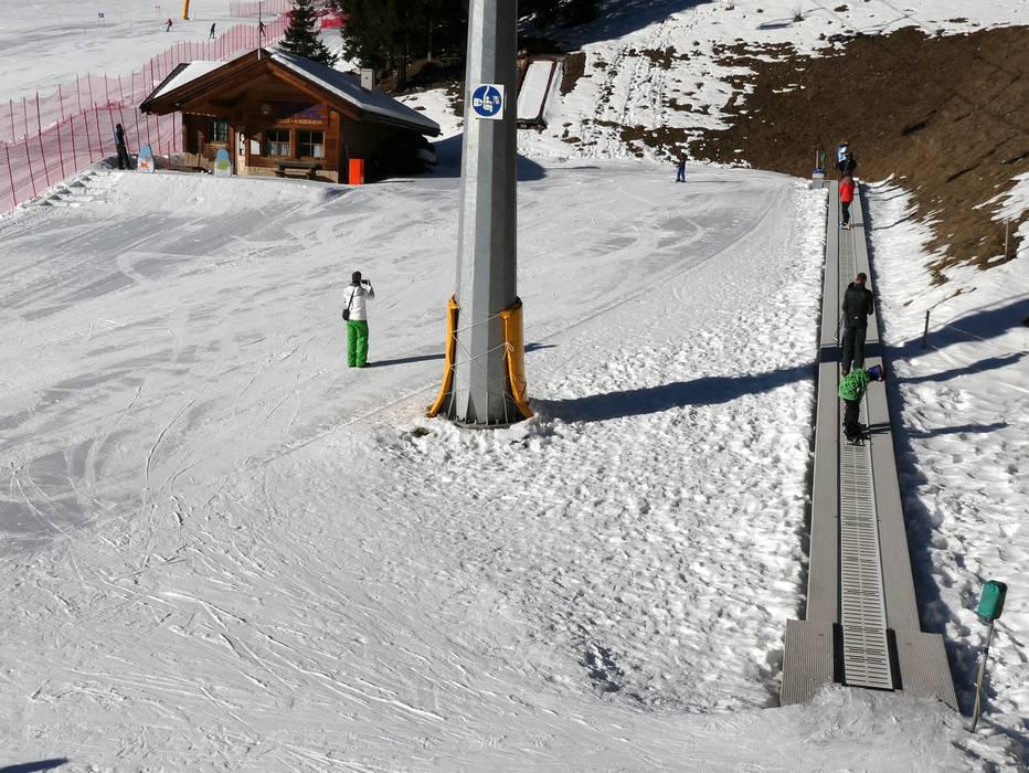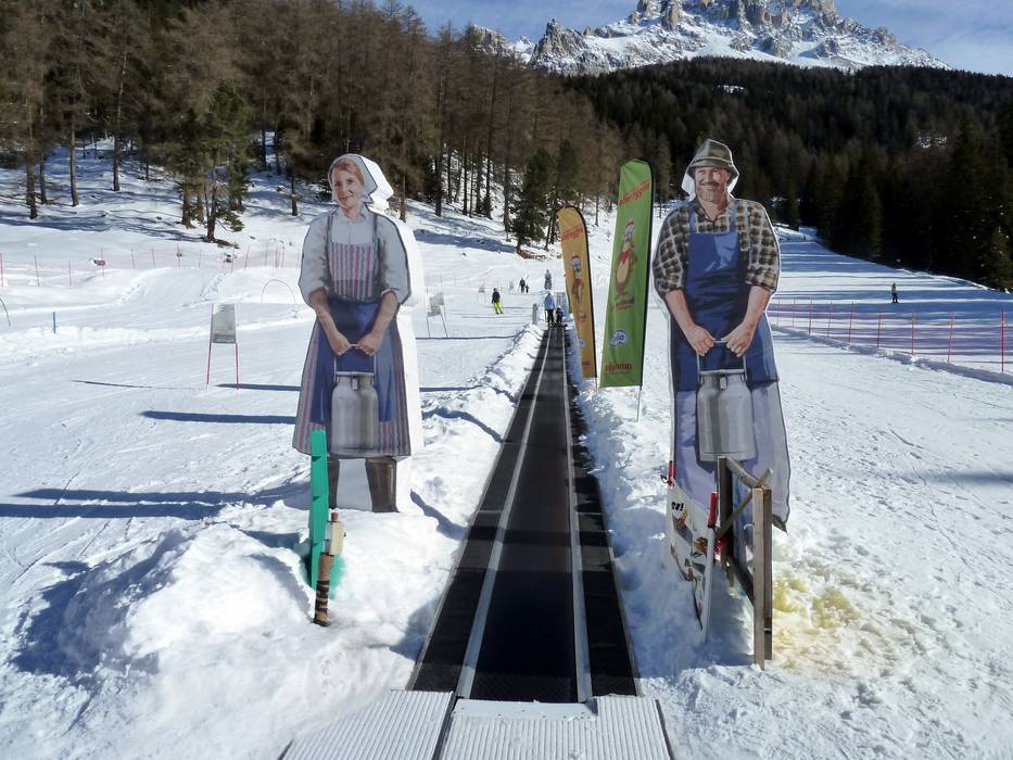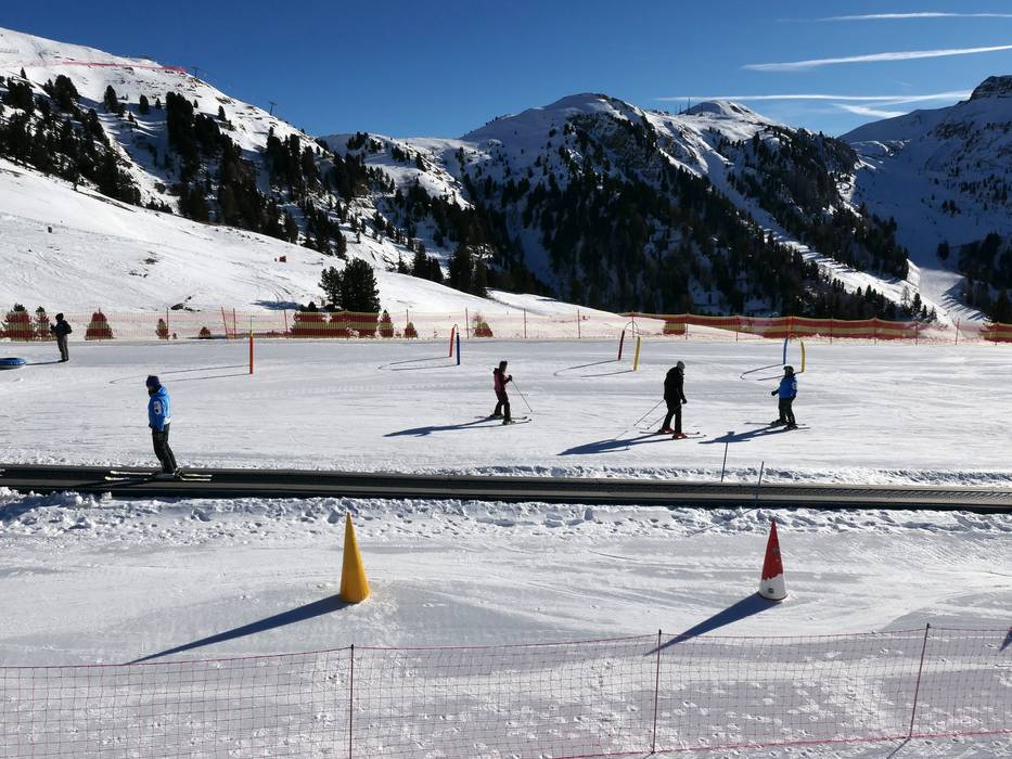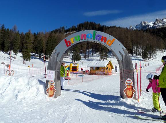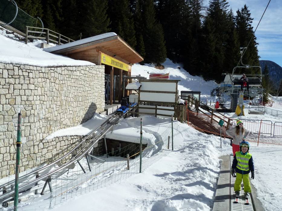 At the mountain station of the gondola lift from Predazzo, there is a supervised kindergarten with a conveyor belt and a children's slope.