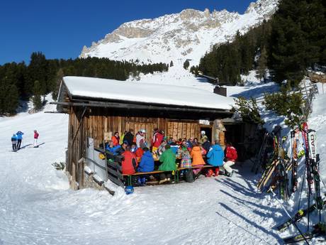 With the Oberholz mountain hut, an architectural gem has been created. Throughout the ski area, rustic and cozy huts invite you to stop for a break. You will also find places to eat at all valley stations. Most of them offer regional specialties from South Tyrol and Trentino. There are also exclusive huts, such as Mayrl Alm, In.Treska, Baita Gardoné, and Berghütte Oberholz.