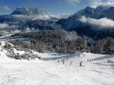 Mogul slope with a view of the Zugspitze 10-seater gondola lift Grubig II Panorama in the Grubigstein ski area