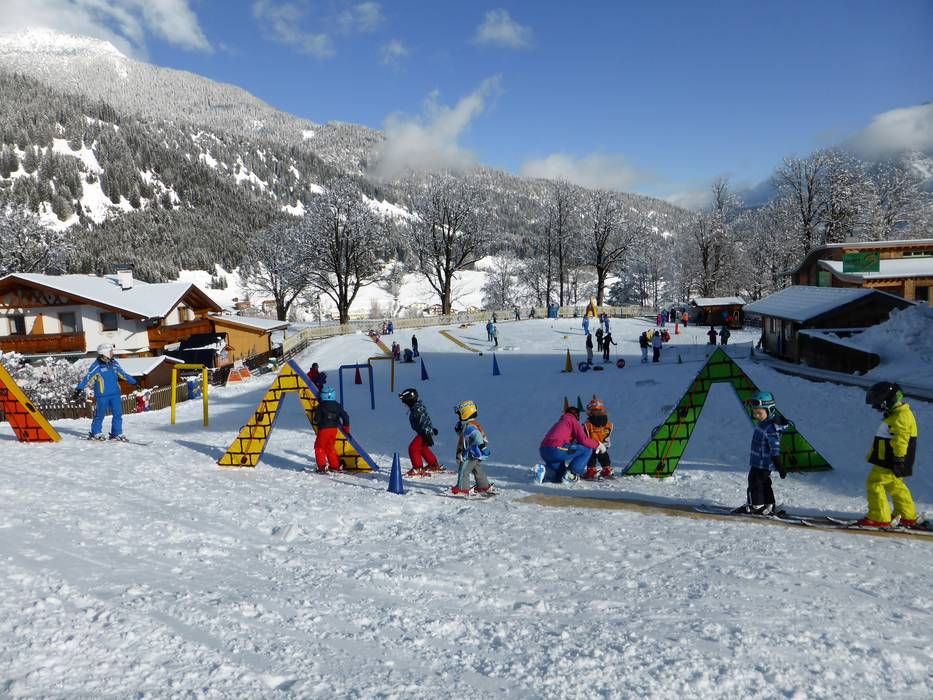 The Alpenrose Familux Resort offers a special service for its hotel guests. The roof of the underground car park on the hotel grounds is cooled and covered with artificial snow. Here, the youngest children (2.5-3.9 years old) can learn to ski. They are regularly visited by the mascot Bobo.