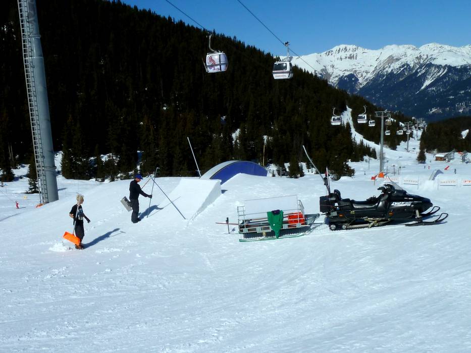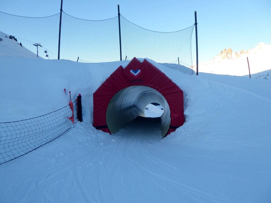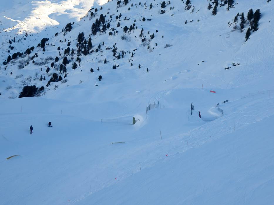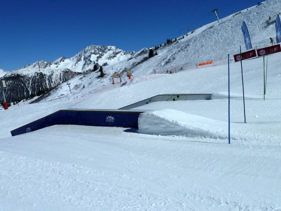 The attractive Snowpark Open Park is located in Méribel-Mottaret at the Châtelet six-seater chairlift in the upper area of the Plattières gondola. The park offers a variety of obstacles, a small halfpipe, and a funslope with a tunnel.