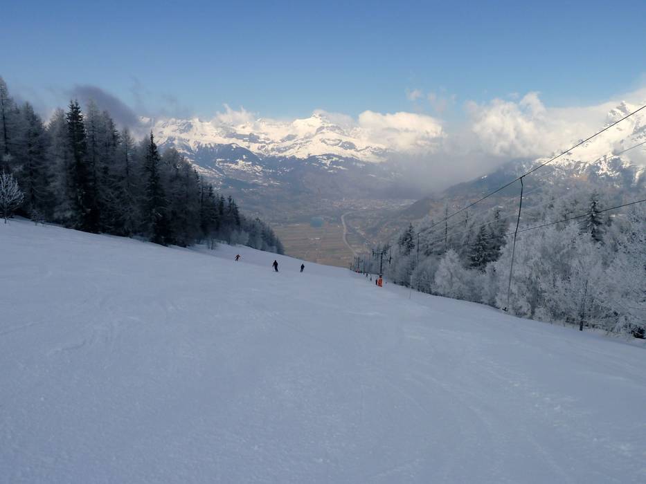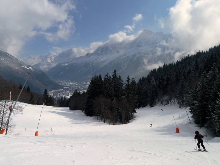 Snow-covered valley runs lead to Les Houches to the Bellevue cable car and the Prarion gondola. There is no valley run to Saint-Gervais.