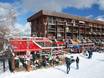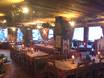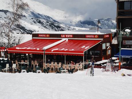 At the long bar, the ESF ski instructors meet, but when the sun is shining, life takes place out on the terrace. For meals, people usually head inside (pizza, Savoyard specialties).