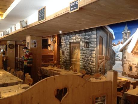 Freshly renovated restaurant with rustic chic in the Galerie Charvin of Le Corbier, accessible from the apartments via the station's endless corridors without getting your feet wet. Wide selection of specialties and wines, friendly service.