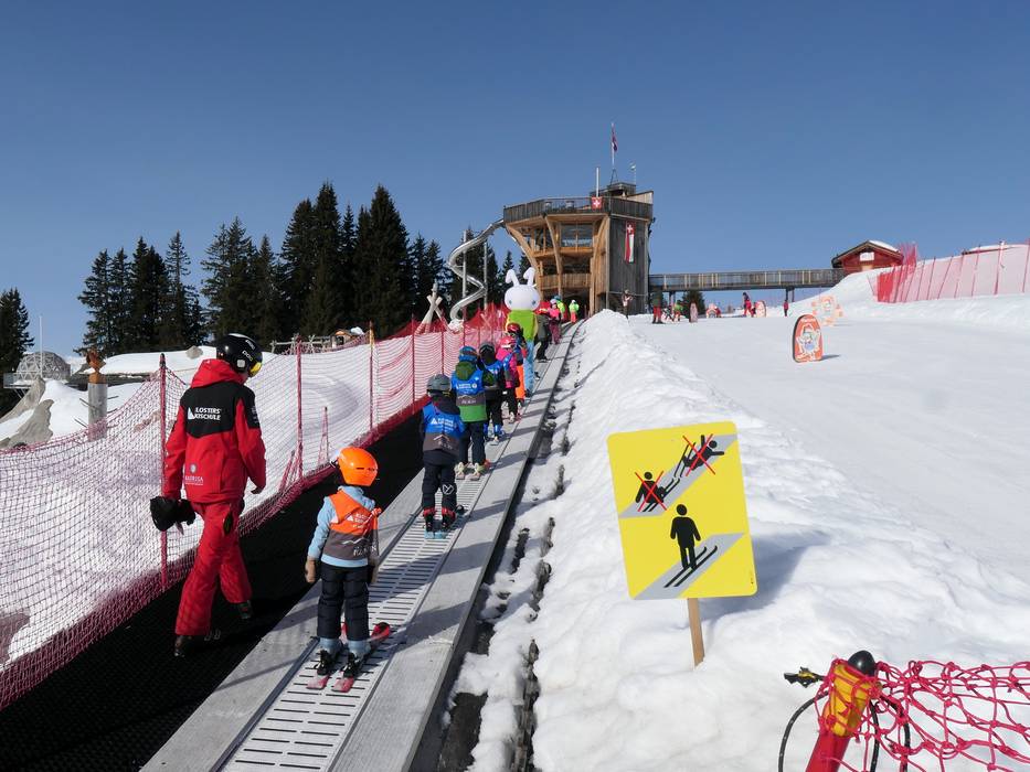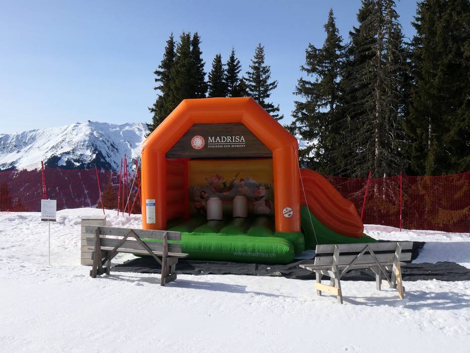 Madrisa-Land is a spacious practice area located right next to the mountain station of the gondola lift and offers several magic carpets for young and older explorers. Funny figures and the slalom slope provide exciting first descents. But the park has even more to offer: whether sledding with funriders or playing on the large bouncy castle – everyone will find something to enjoy here. From the sunny terrace of Madrisa-Alp, you always have a great view of the entire practice area.