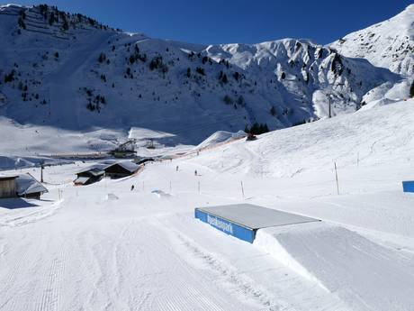 At the mountain station of the Ahorn, waves, steep turns, boxes, and a tunnel provide skiing fun.