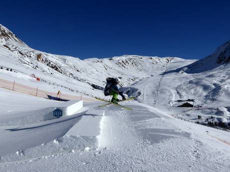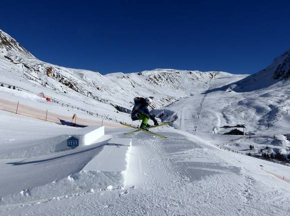 The Snowpark Meran 2000 is located on the Oswald piste and can be reached quickly and easily with the St. Oswald four-seater chairlift. The boxes, kickers, and rails make freestyle enthusiasts' hearts beat faster. The chill-out zone even offers power outlets and Wi-Fi.