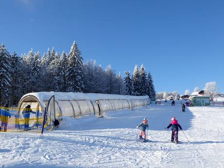 The Mitterdorf ski resort in the Bavarian Forest is considered particularly family-friendly. Almost all slopes are ideal for families, and the chairlifts are equipped with child safety features. The Junior-Ski-Zirkus offers an excellently equipped practice area for little skiers and beginners – with covered conveyor belts and child-friendly teaching materials, perfect for those first experiences on skis. A toboggan run with its own conveyor belt completes the range of activities. Especially attractive are the affordable family passes.