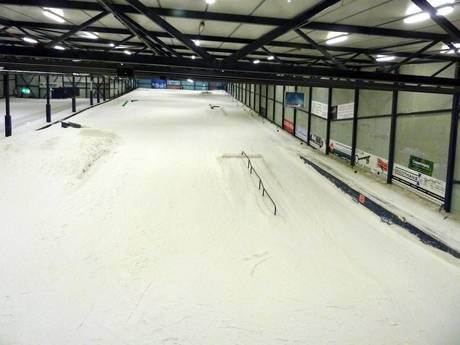 Throughout the entire ski hall, you will find kickers, rails, and boxes distributed. These are located on the main slope and are easily accessible via the conveyor belt or the rope lift.