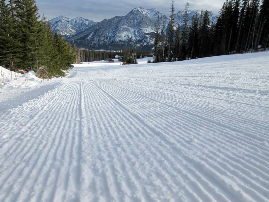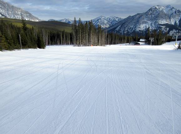 In the Nakiska ski area, almost all slopes are perfectly groomed every day with great attention to detail. Only the cleared forest runs (Gladed Runs) cannot be groomed.