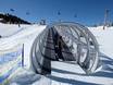 Directly at the mountain station of the Bergkastel cable car, you will find the spacious and versatile Nauderix Kinderland of the Nauders Interski ski school. It is equipped with ski school lifts, magic carpets (conveyor belts), Nauderix Mini Village, tubing track, children's carousel, Indian tent, playground, and much more.