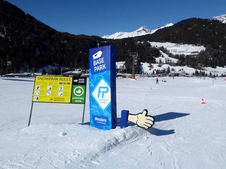 The Flow Parks Nauders (Base Park, Scenic Park, and Pine Park) are spread throughout the Nauders ski area. The parks are mostly easy and are entirely designed for families with children.