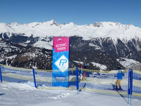 The Scenic Park is part of the Flow Parks Nauders. The highest snowpark in the Nauders ski area starts just below the top station of the Zirmbahn at around 2,600 m. Beginners and advanced riders can look forward to a colorful mix of various obstacles with a magnificent view of the mountain scenery.