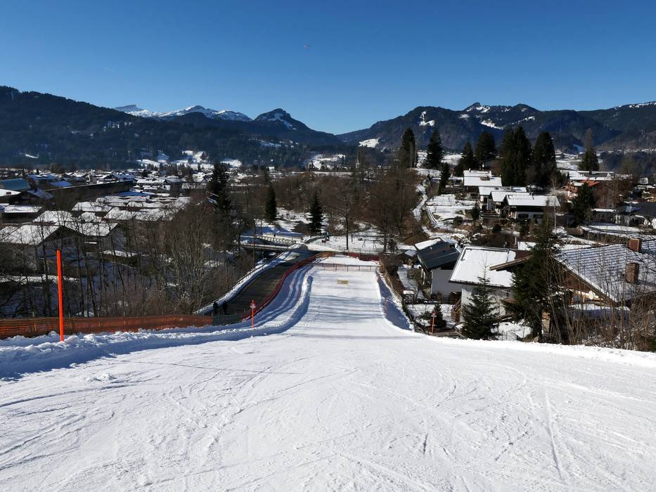 Snow-covered valley run down to the outskirts of Oberstdorf. From there, a short walk (200 m) to the valley station of the Nebelhornbahn.