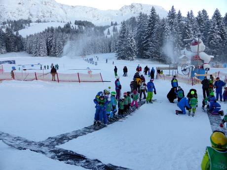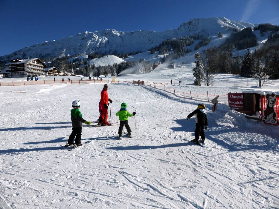 The ski resort is very well suited for children and families. At the valley station of the Iselerbahn, you’ll find the Schneekinderland of the Skischule Ostrachtal, a large and lovingly designed practice area. There is another well-equipped children’s area run by the Skischule Iseler at the Schwandenbahn. The Skischulen Lanig and SnowAcademy also operate children’s areas. The slopes at the Schwandenbahn and the Idealhanglift are easy and provide an ideal practice area. The new 8-seater Schwanden chairlift has child safety features, just like the new Grenzwies and Wiedhag chairlifts. The clear layout of the ski resort is also a big advantage for families. With the Oberjoch Familux Resort, a leading family hotel is located right at the ski resort.