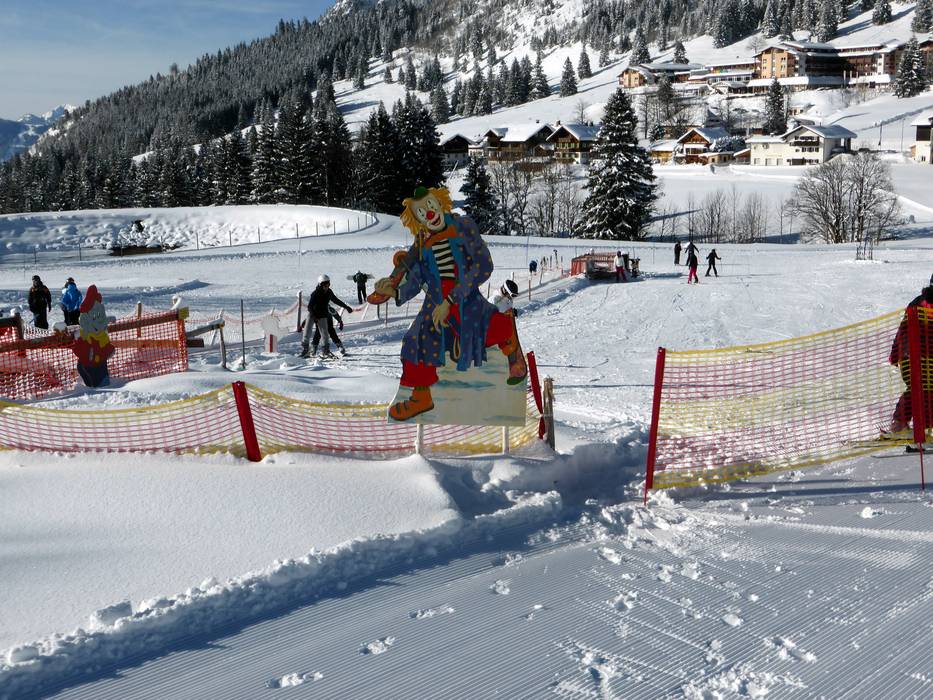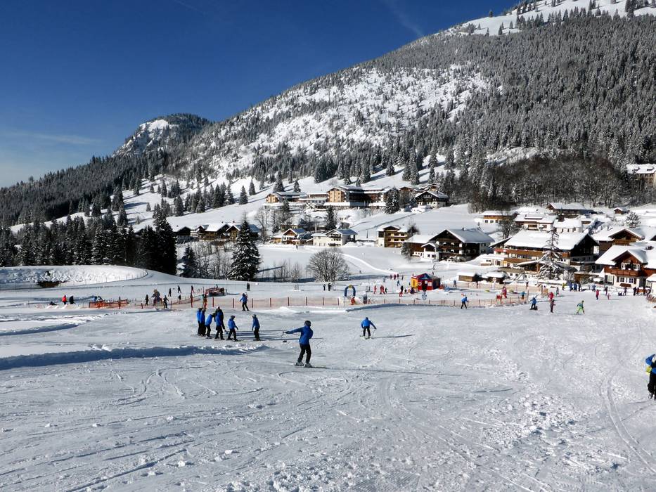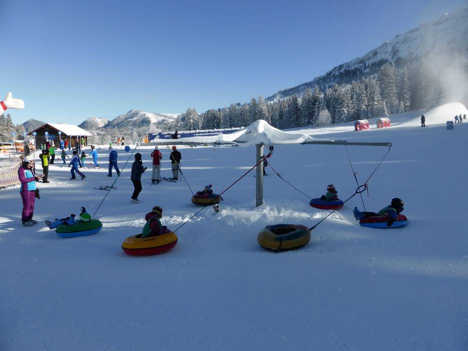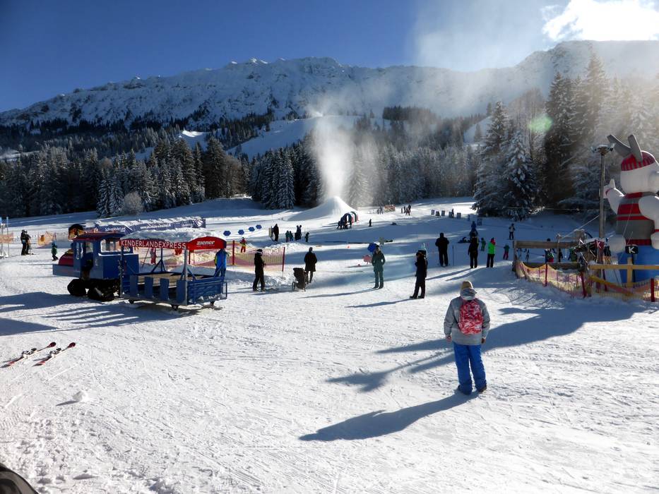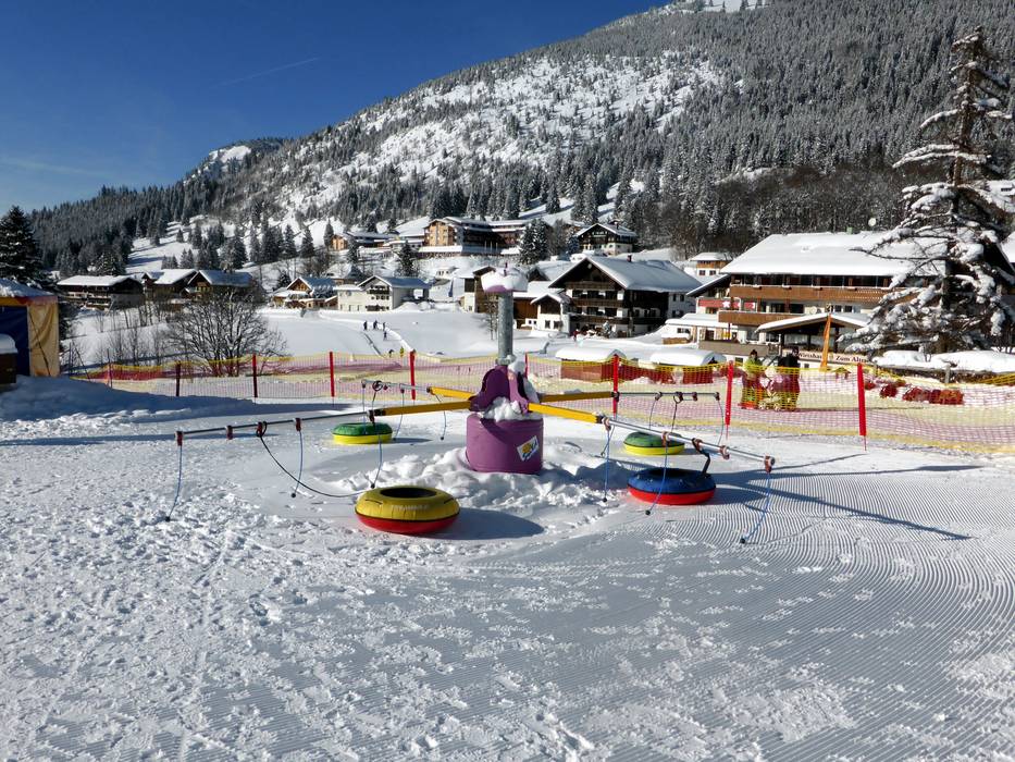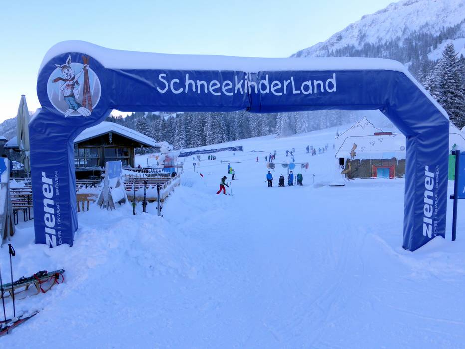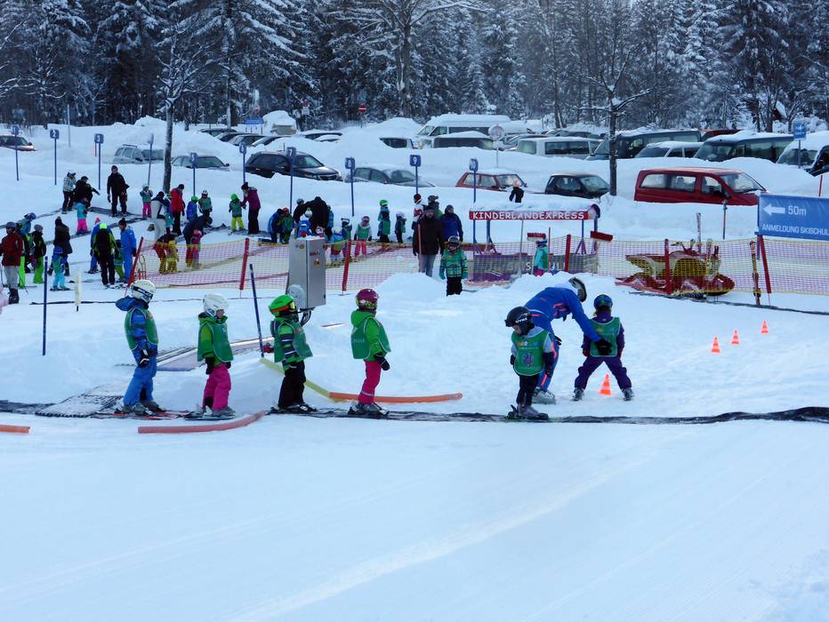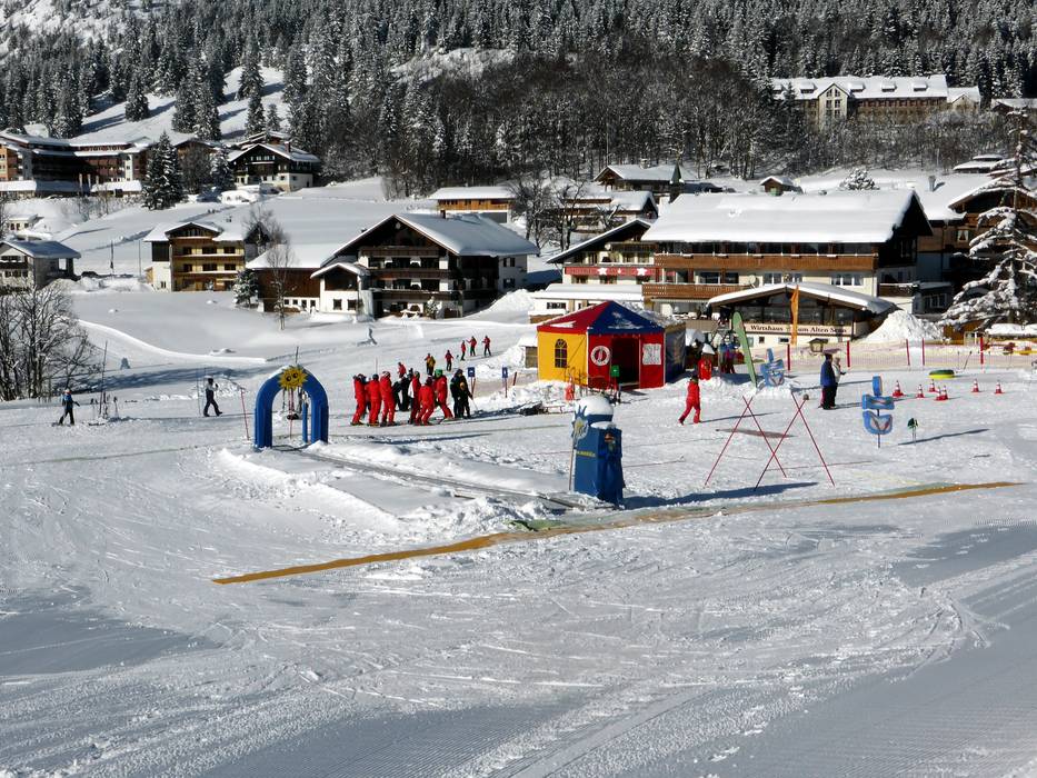 The Schneekinderland of the Ostrachtal Ski School is a lovingly designed practice area. In a playful and varied way, children can learn to ski and snowboard on more than 20,000 m². The very well-equipped children's area offers several conveyor belts (magic carpets) and rope lifts with different terrain features. Other highlights include the jump and slalom course, a zone with banked turns, the fairytale forest with animals, the mascot, the snow carousel, and a rainbow forest. The ski school team is highly dedicated. Toilets and the children's play hut (warming room) are located directly on the premises. With the Kinderlandexpress, advanced children are taken to the Schwandenbahn (8-seater chairlift with weather protection hood and child safety features). At this beginner area, children can improve their skills ideally. For ski course participants and Bad Hindelang Plus holders, Schneekinderland is free of charge; otherwise, it can be used independently for a small fee. Schneekinderland is open daily in winter.