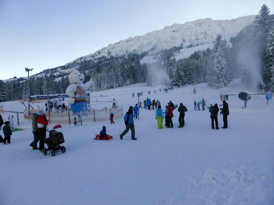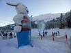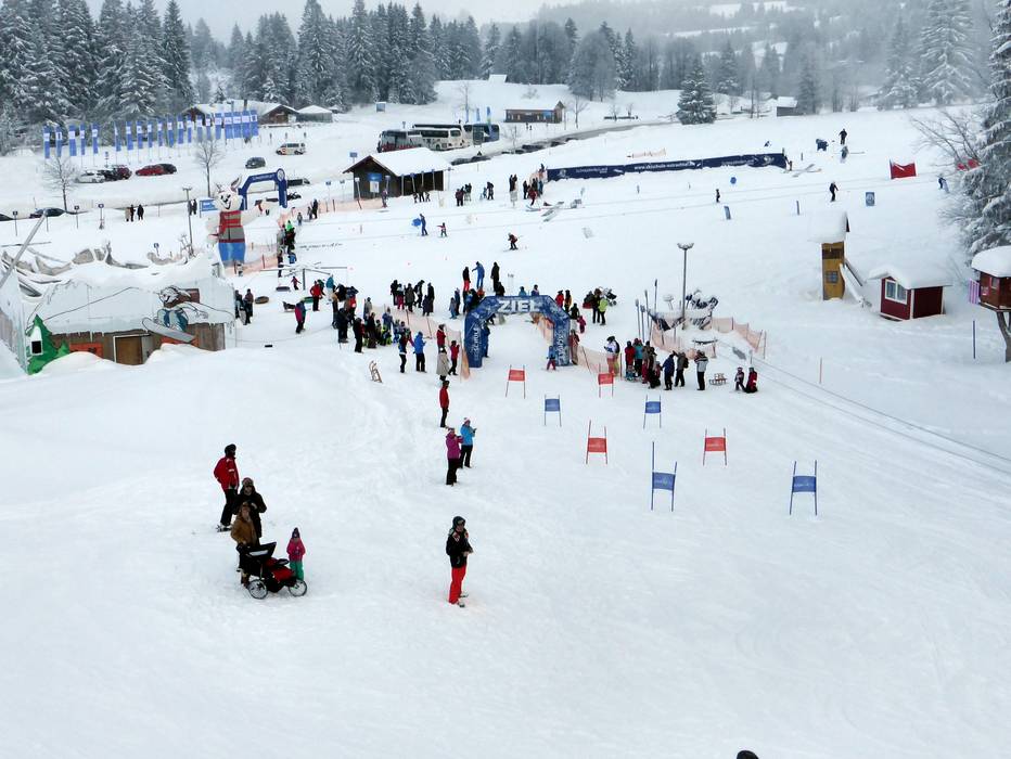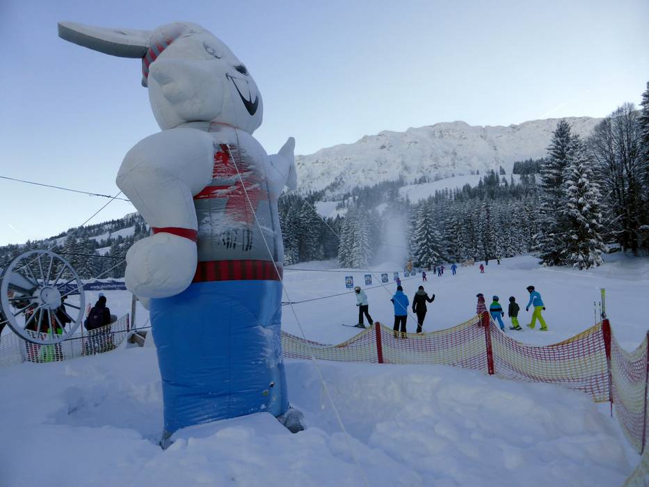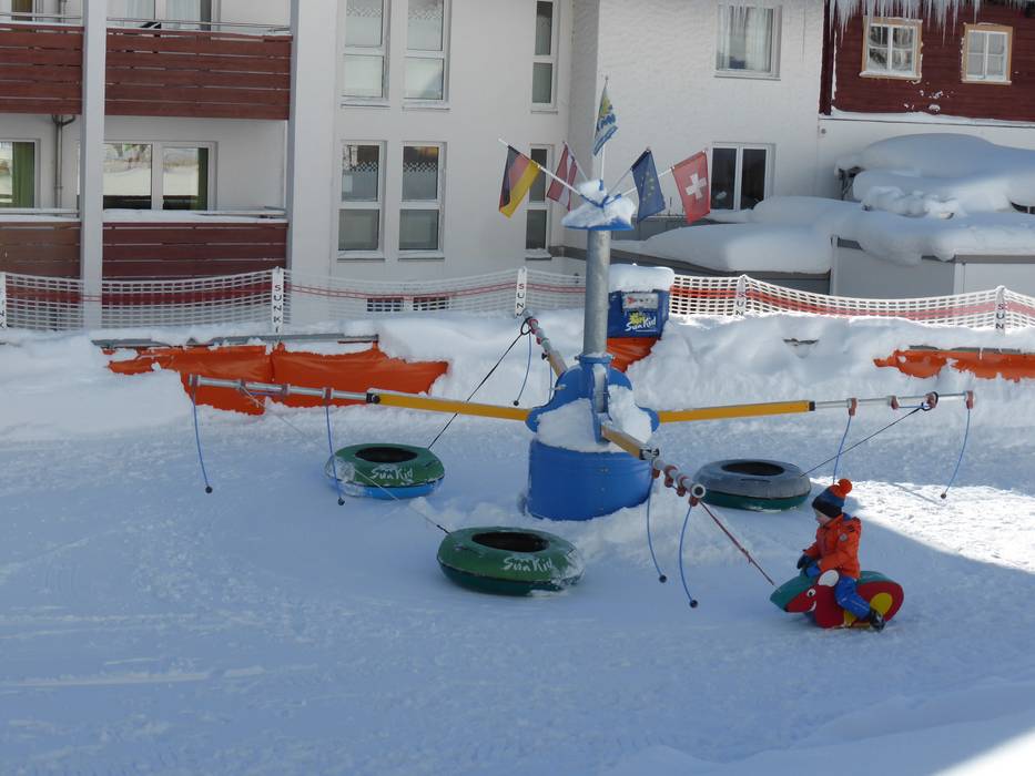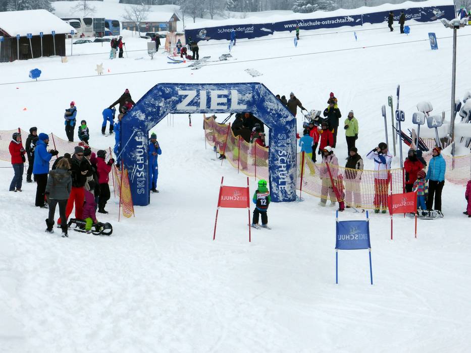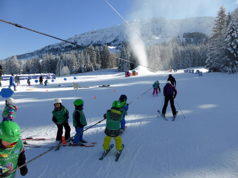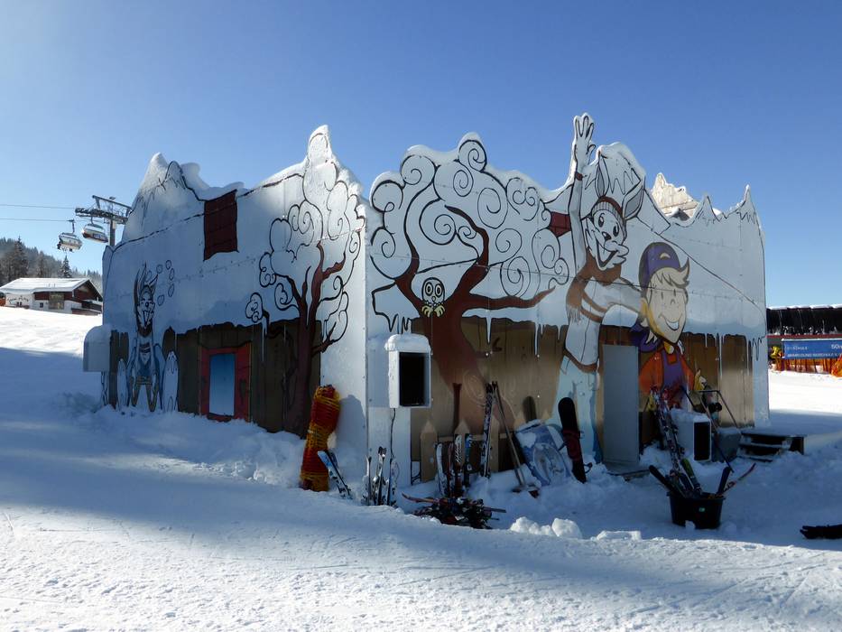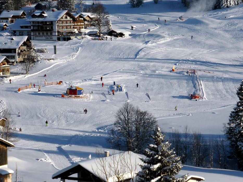 The Schneekinderland of the Ostrachtal Ski School is a lovingly designed practice area. In a playful and varied way, children can learn to ski and snowboard on more than 20,000 m². The very well-equipped children's area offers several conveyor belts (magic carpets) and rope lifts with different terrain features. Other highlights include the jump and slalom course, a zone with banked turns, the fairytale forest with animals, the mascot, the snow carousel, and a rainbow forest. The ski school team is highly dedicated. Toilets and the children's play hut (warming room) are located directly on the premises. With the Kinderlandexpress, advanced children are taken to the Schwandenbahn (8-seater chairlift with weather protection hood and child safety features). At this beginner area, children can improve their skills ideally. For ski course participants and Bad Hindelang Plus holders, Schneekinderland is free of charge; otherwise, it can be used independently for a small fee. Schneekinderland is open daily in winter.