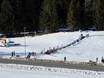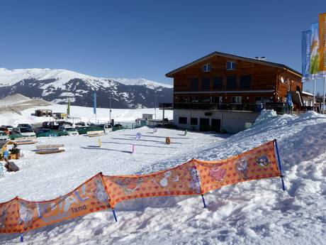 The children's area in Cuolm Sura is operated by the Mundan ski school and offers plenty of space for little ones to practice. Conveyor belts, fun figures, a children's carousel, and a wave track are available here.