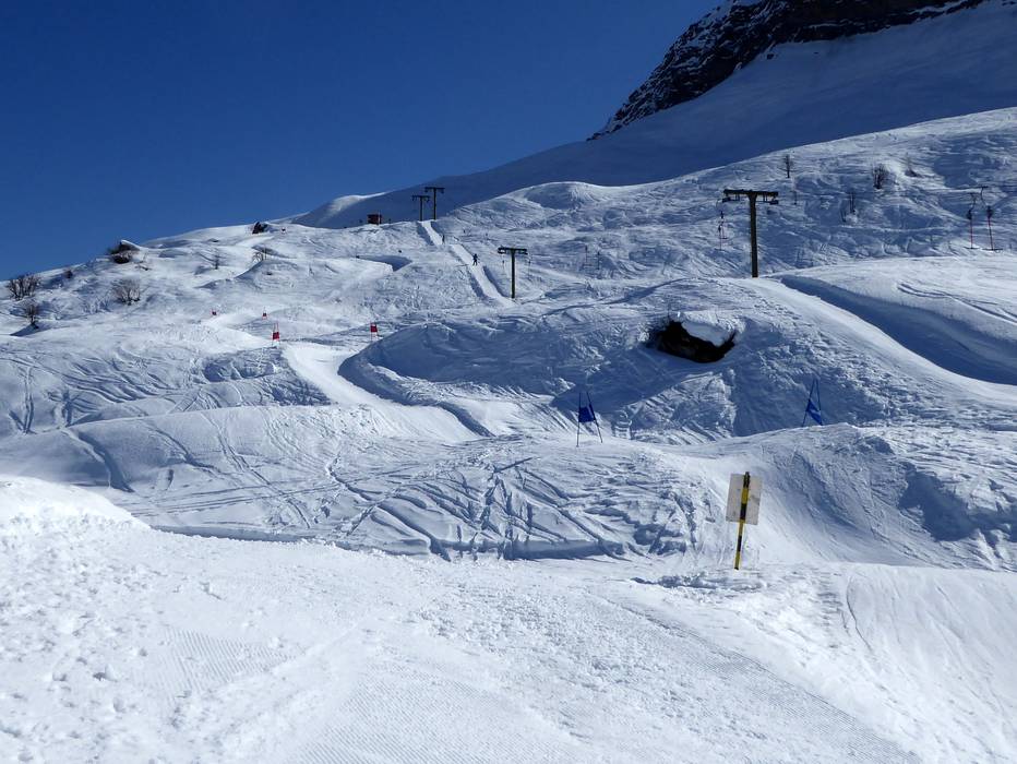 The clearly laid-out snowpark is located at the Plitschès drag lift and, in addition to kickers, rails, and boxes, also offers a wave track and a boardercross.