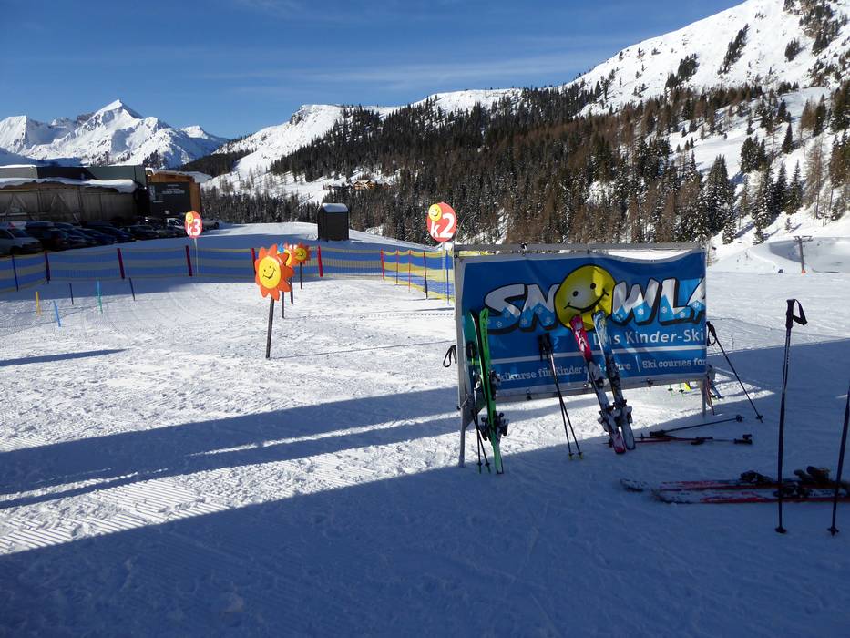 Not far from the Obertauern tourist information office is the Kinderland of the TOP Ski School. Cheerful figures watch the children as they learn to ski on the magic carpet and rope lift.