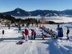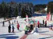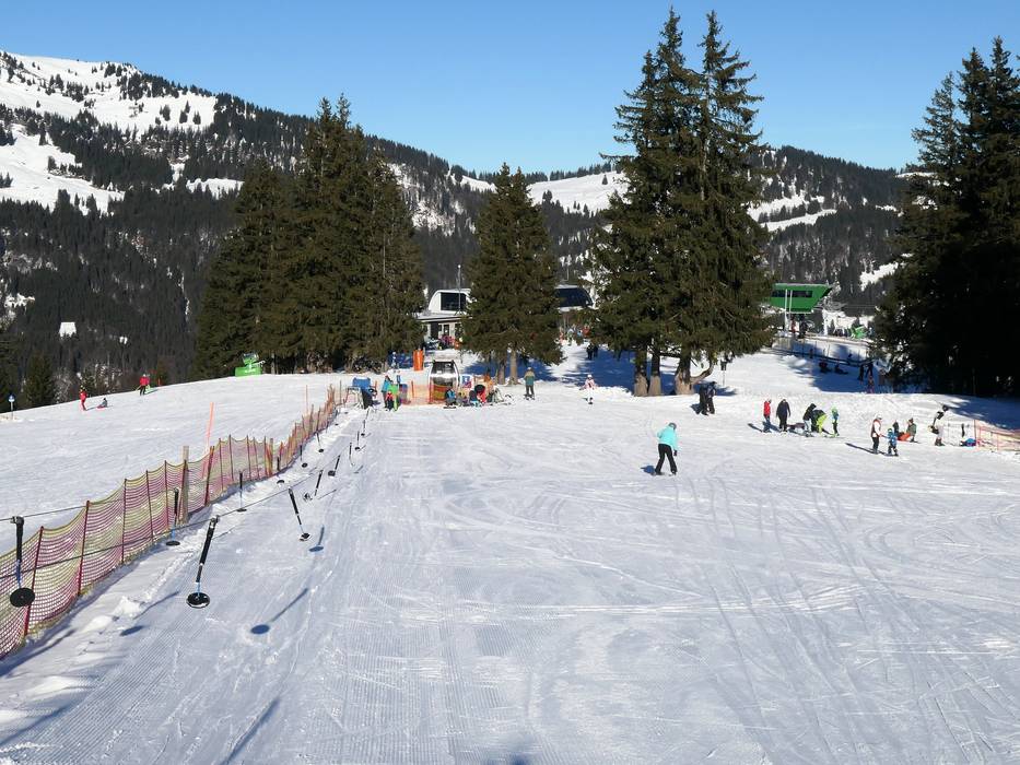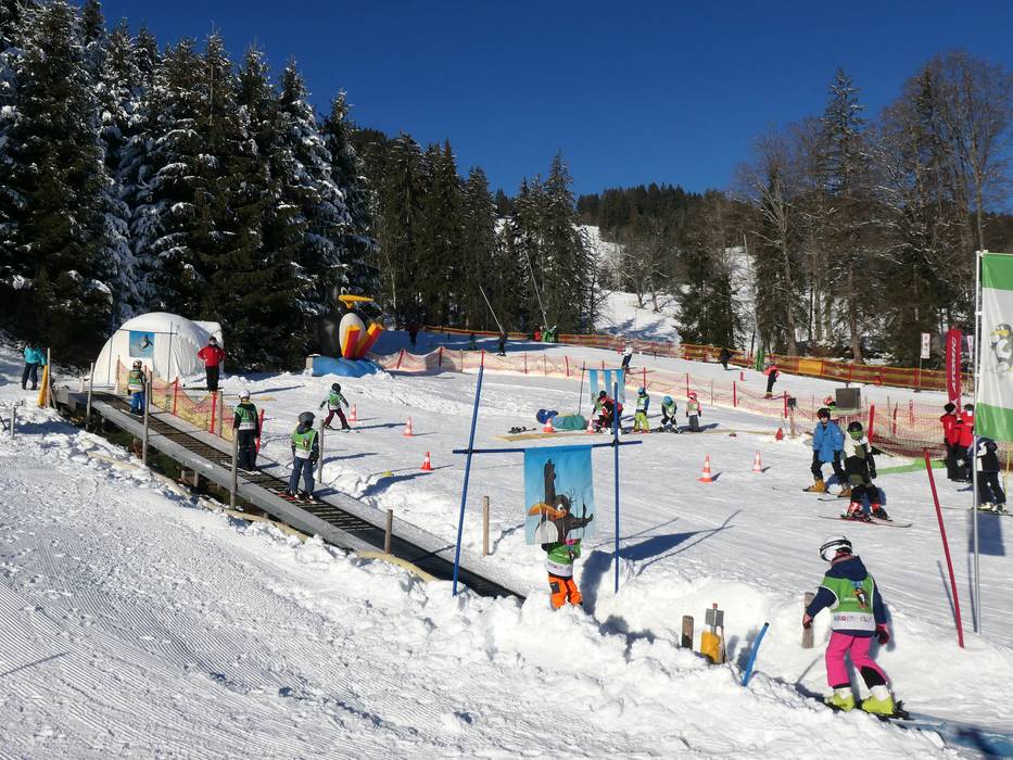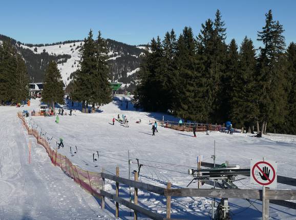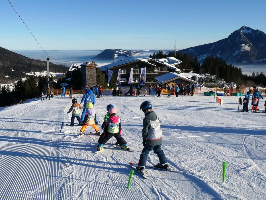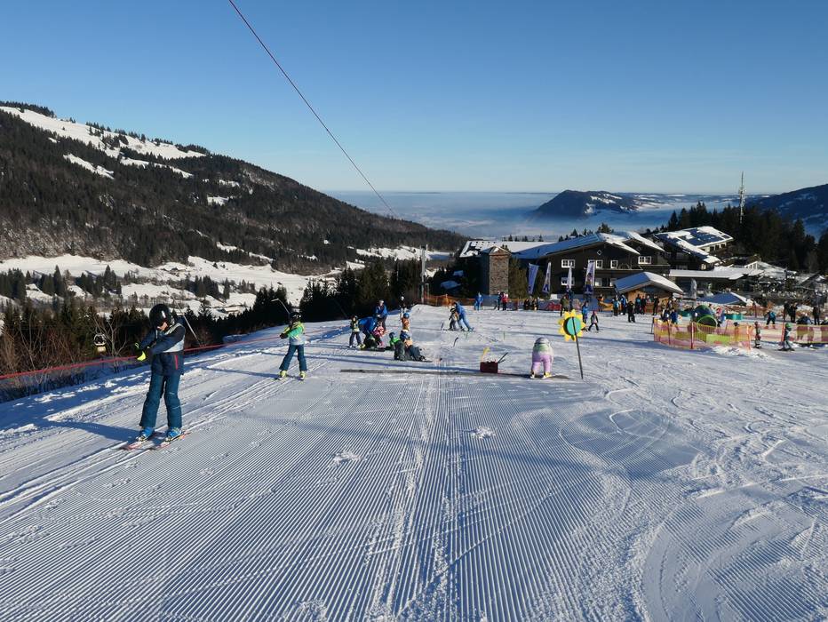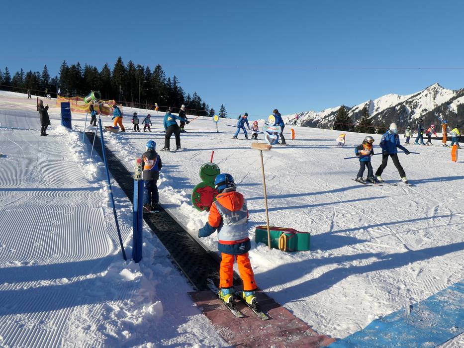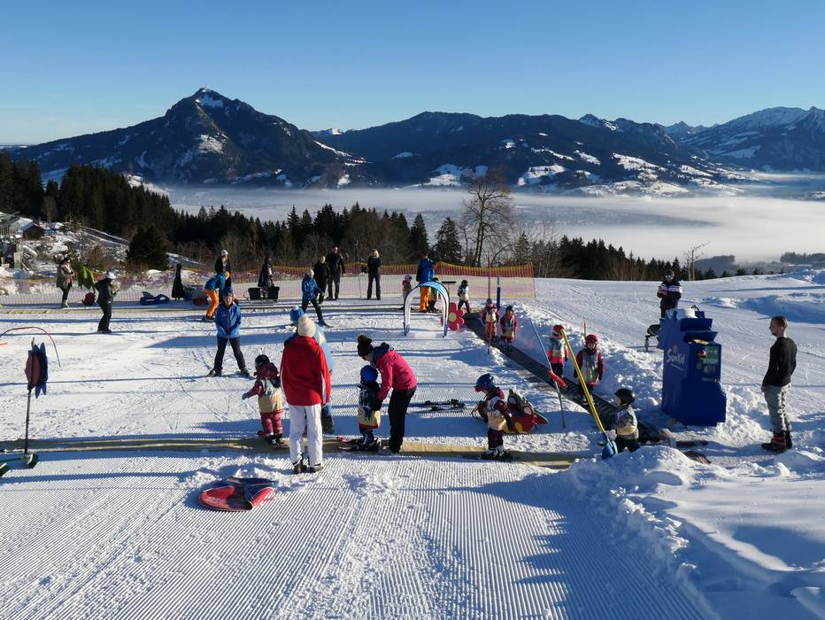 At the mountain station of the Ossi-Reichert-Bahn and the Weltcup-Express, there is a dedicated children's area operated by the Bergbahnen Ofterschwang-Gunzesried. A special ski pass including ascent and descent is available for purchase. The sunny location offers beautiful mountain views. A practice lift and a conveyor belt are available here for children and beginners. The ski schools of the ski area also provide lessons in this practice area.