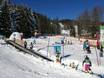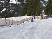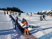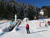 The children's area is located right next to the valley station of the Weltcup-Express and is easily accessible by car. There are magic carpets, fun figures, and a tipi tent. Additionally, a practice lift from the ski area is available next to the children's area. Less than 50 meters from the children's area, there are two restaurants offering affordable children's meals.