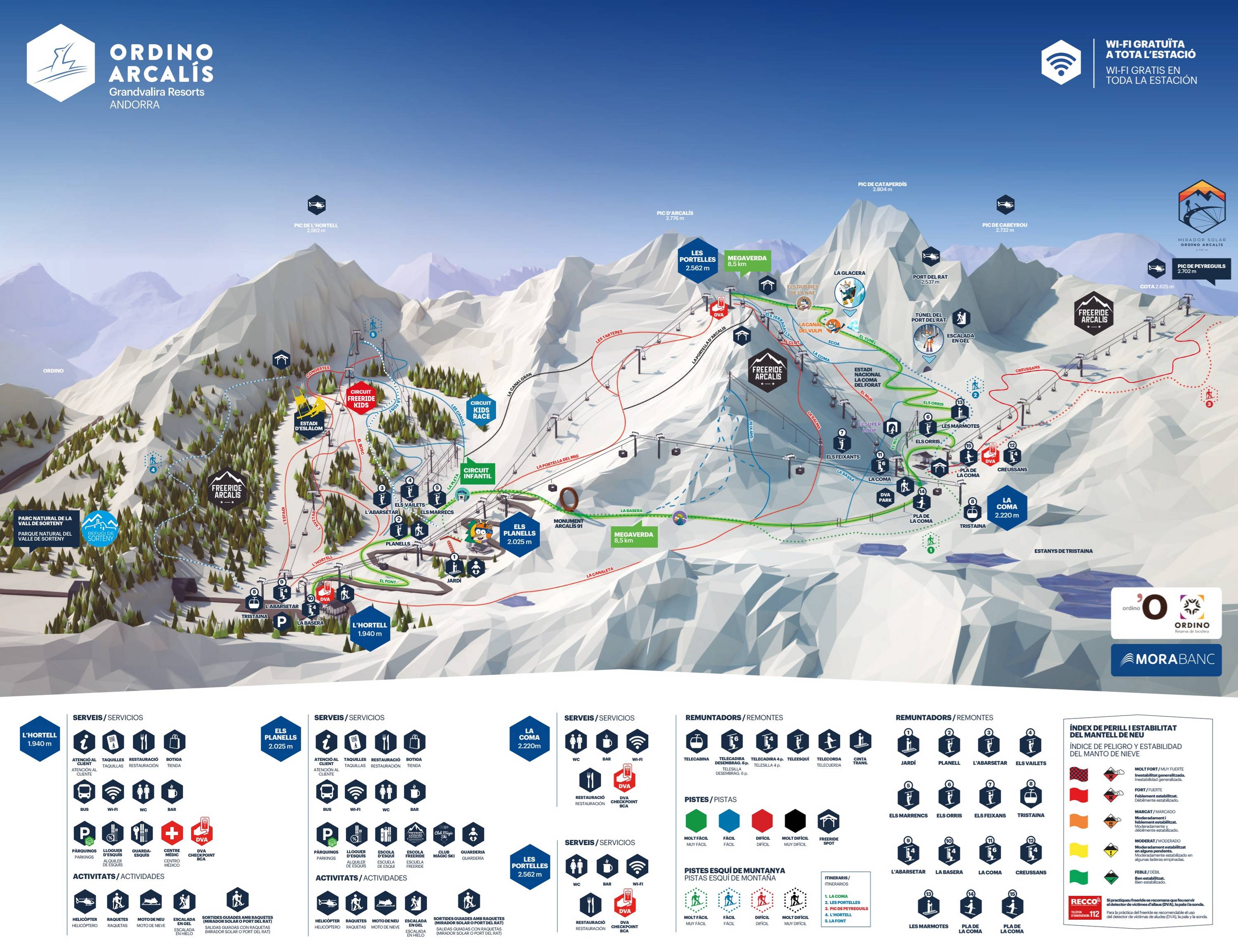 The slope map provides a good overview of the two ski areas, Arcalís and Pal-Arinsal (Vallnord). It is available in several languages for international guests. Lifts and slopes are labeled with names.