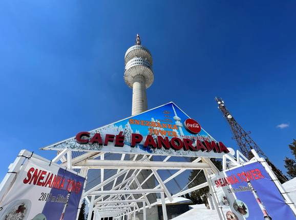 In the television tower below the observation deck at 2,019 m. The ascent, which is subject to a fee, is by elevator.