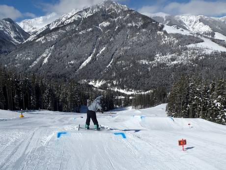 The Stringer Terrain Park is ideal for beginners and families. It stretches along the easy Stringer slope and is easily accessible via the Discovery Quad.